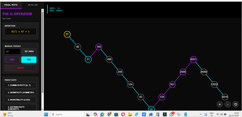 You can see the Accelerator (G-Operator) trying to boost the integer systematically up the Y-axis to higher structures, while the standard Collatz rules (Force of Chaos) intervene, crashing the trajectory back down toward the “ground state” at the bottom of the grid.