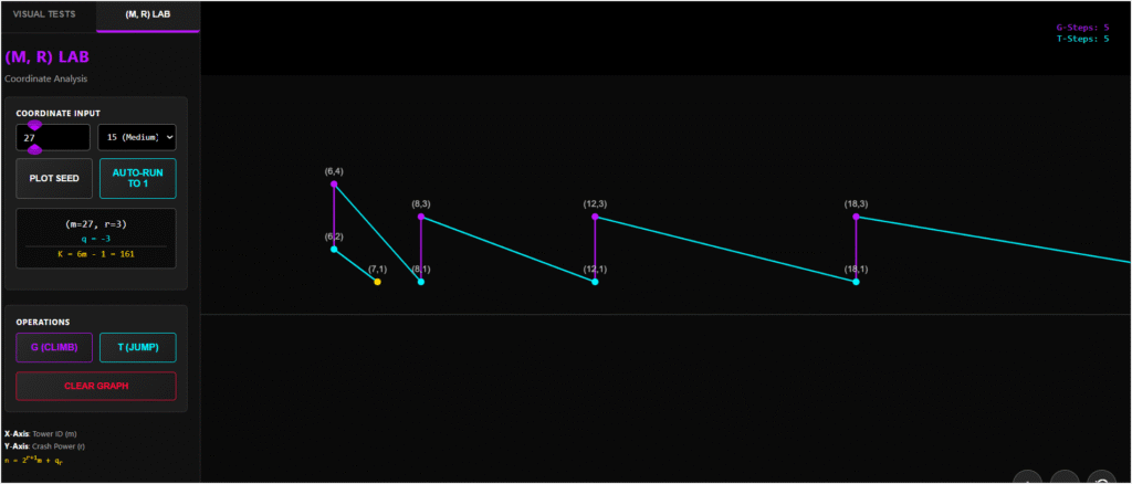 This view visualizes the “phase space” of the odd integers. It places every integer on a 2D coordinate grid based on the parameters defined in my research (m on the X-axis, r on the Y-axis).