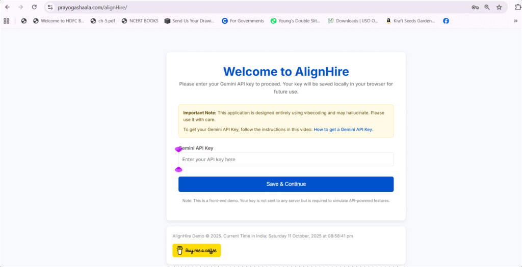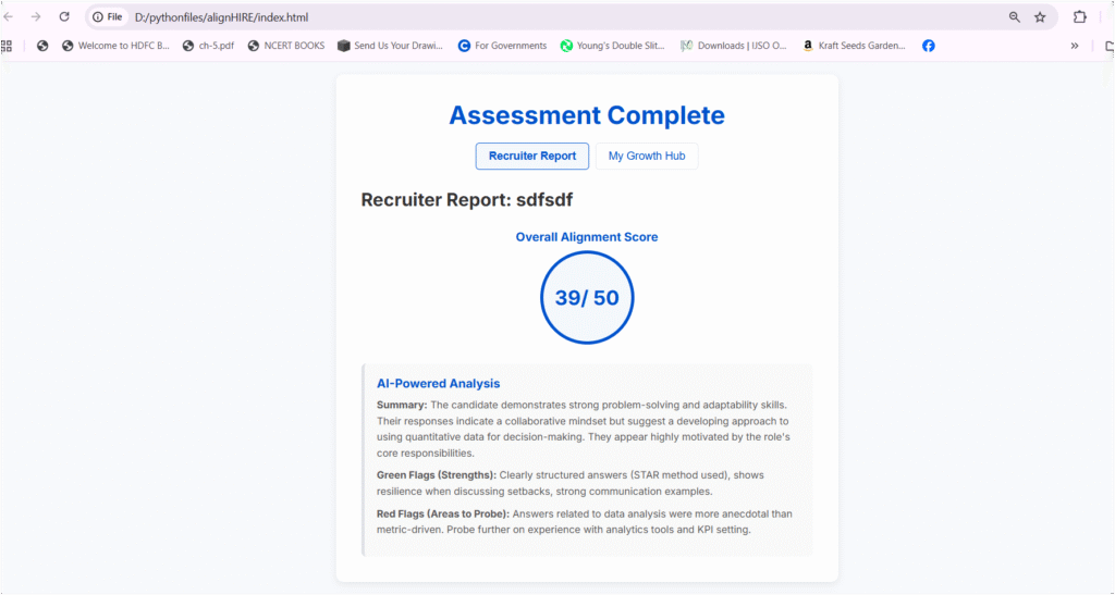This was it! A way to use technology for good—to eliminate bias and find the right human, not just the right keywords. My mission became clear: build an application, AlignHire, that would embody this philosophy. You can access this app by clicking on this link. The app would take a job description, use AI to generate insightful behavioral questions, and then analyze the candidate’s answers to gauge their critical thinking, problem-solving skills, and alignment with the company’s vision.